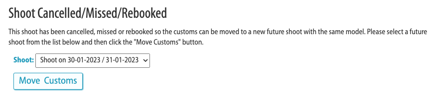 If a shoot is marked as cancelled, missed or rebooked then the custom shoots associated with the shoot can be moved to a future “booked” shoot with the same model. When the shoot is marked as cancelled, missed or rebooked, you will see the following option on the “customs” page for that shoot: