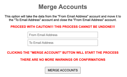 Read the warning messages and make sure you have it the right way around before you click the “MERGE ACCOUNTS”, there is no confirmation popup, etc… Once you click “MERGE ACCOUNTS” it will do it.