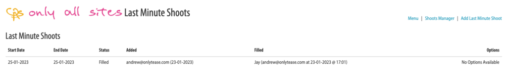 The last minute shoot will then be shown on the list of the last minute shoots along with it’s status, who added and when and a “Mark as Filled” option.