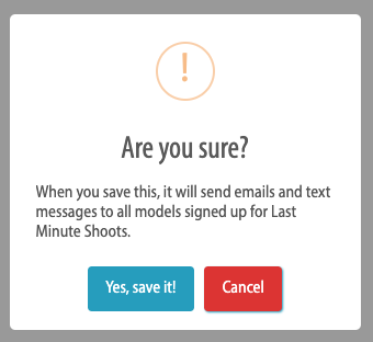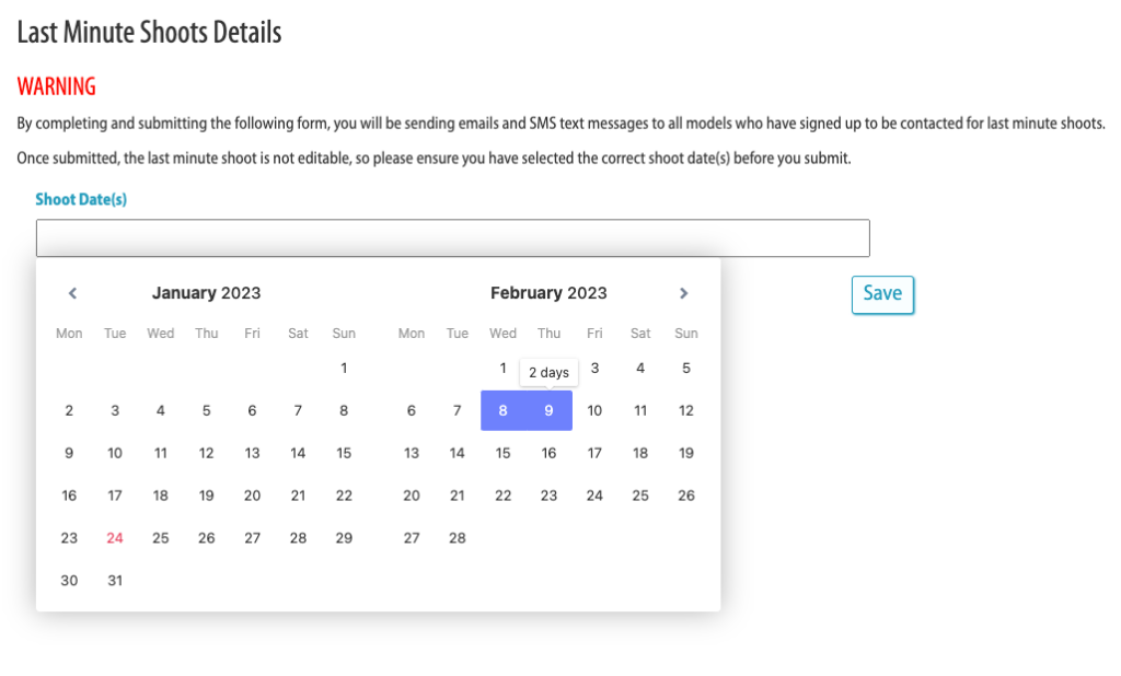 As soon as you click “Yes, save it!”, it will save the last minute shoot and emails and SMS text messages will be sent to all models that have signed up to receive notifications of last minute shoots. THERE ARE NO FURTHER WARNINGS. Please ensure you have selected the correct date(s) before saving as these dates are included in the notifications sent to the models.