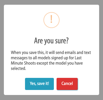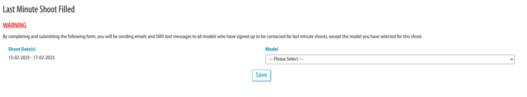 As soon as you click “Yes, save it!”, it will save the last minute shoot and emails and SMS text messages will be sent to all models, except the one selected, that have signed up to receive notifications that the shoot has been filled. THERE ARE NO FURTHER WARNINGS. Please ensure you have selected the correct model before saving so the model filling the shoot doesn’t receive the filled message.