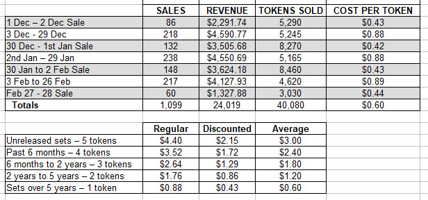 - A potential 25% increase in pricing on tokens would bring the average weighted cost per token from $0.60 to $0.75. The average cost breakdown of an unreleased set would then bump up to $5.50 / $2.69 / $3.75