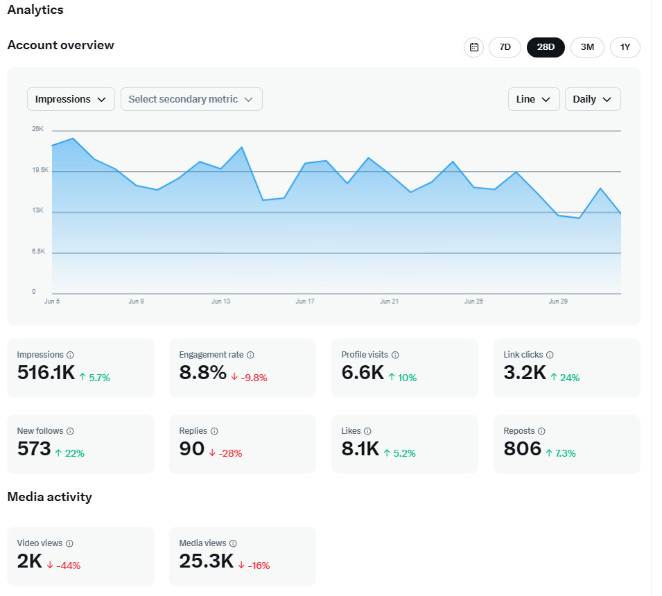 - Layered-Nylons Twitter followers increased to 1,066 from 854. Analytics is only available to premium users but I will be doing some analysis manually. In June there were 29 tweets for 65,212 impressions that lead to 1,265 profile visits, 324 link clicks, 1,602 likes, 316 retweets and 14 comments.