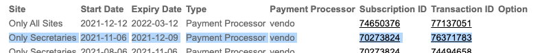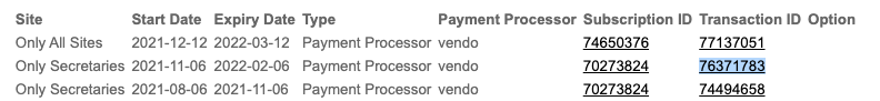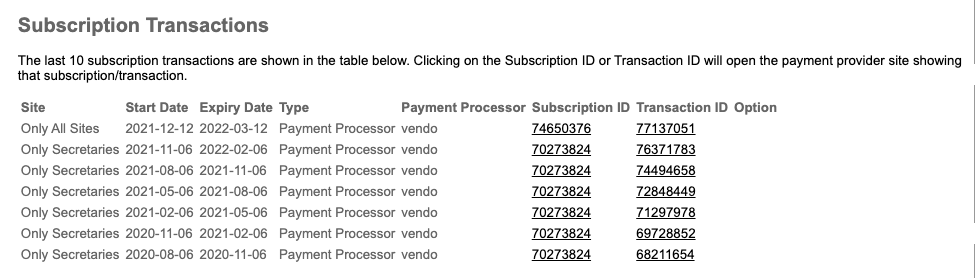 Once you have located the user you will see the last 10 transactions for the user in the “Subscription Transactions” section, like this: